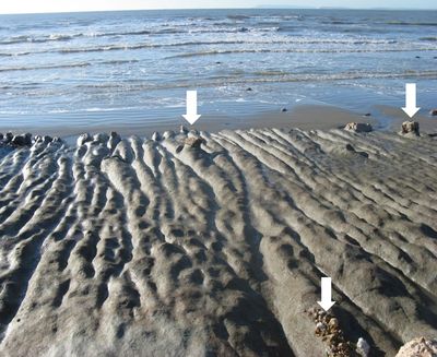 Grooves, also termed gutters, furrows or runnels, are linear erosional bedforms cut into soft bedrocks (pictured left) whose formation remains a mystery. This type of bedform is usually found on steep beaches exposed to wave action. Grooves are regularly spaced, more-or-less parallel along the shore, and may be deeply incised into the seabed. The spacing ranges from decimeters to meters. Grooves are long and sinuous across the beach face. The density of grooves increases from the upper to the lower beach in the cross-shore direction. The incision depth is usually less than 1 m and reduces from the top to the bottom of the beach (Carling et al., 2018).
